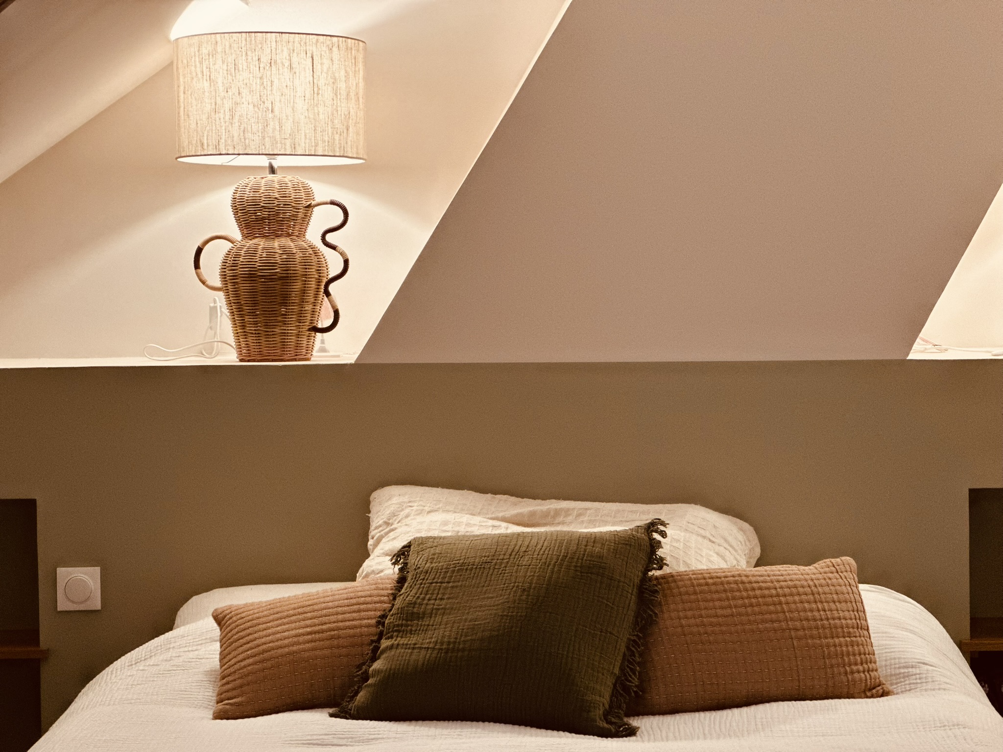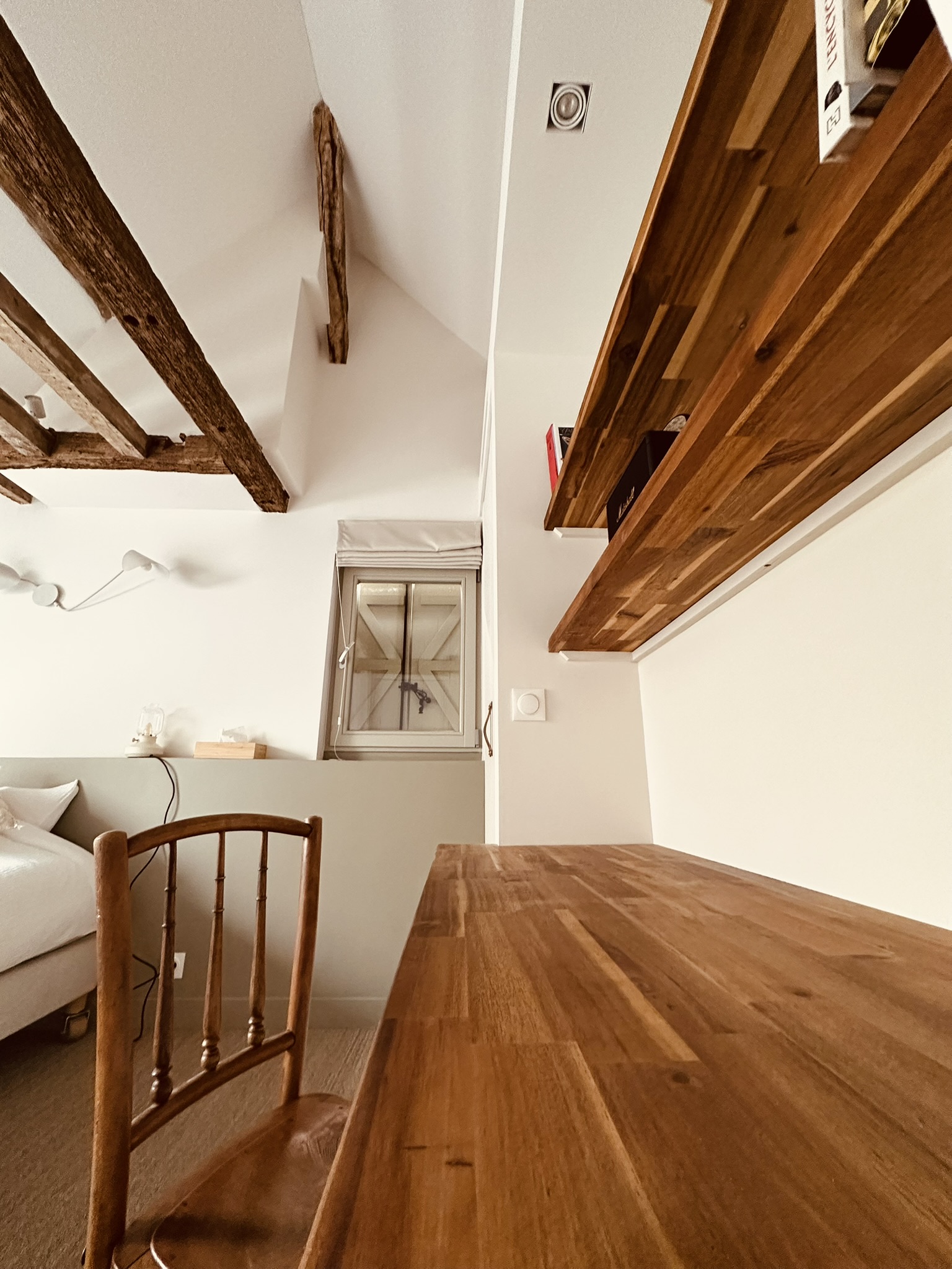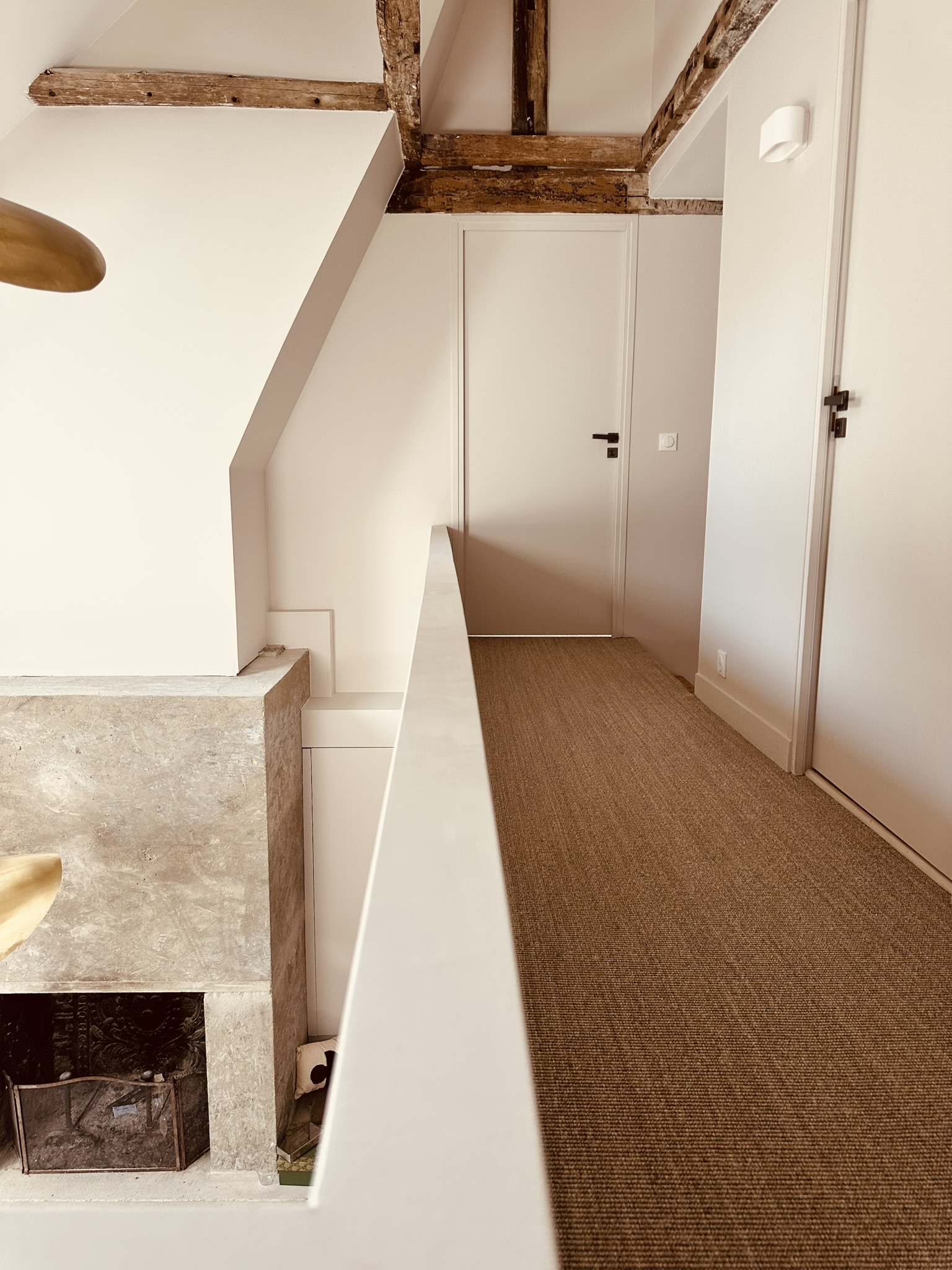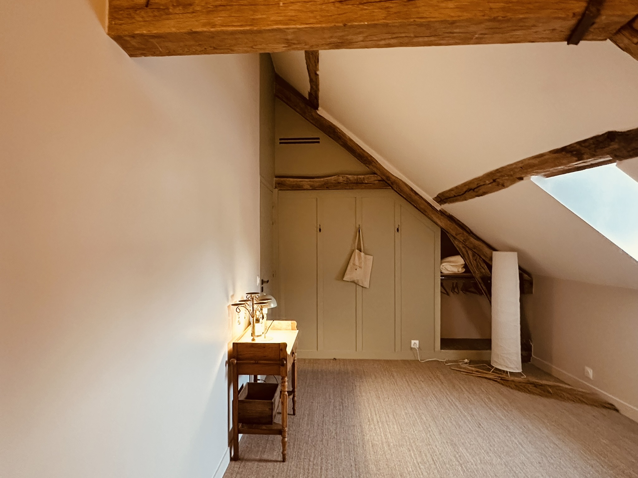 La volonté des propriétaires était de conserver un maximum d’éléments et de matériaux d’origine et d’orienter la décoration vers un esthétisme organique et épuré. Entre vieilles tommettes, poutres et briques originelles, un équilibre a été trouvé entre sobriété et chaleur. Une recherche de simplicité qui est également passée par l’emploi de matériaux bruts tel le béton, la création de nombreux rangements afin de désencombrer au maximum les espaces et l’intégration de pièces chinées et d’artisanat.