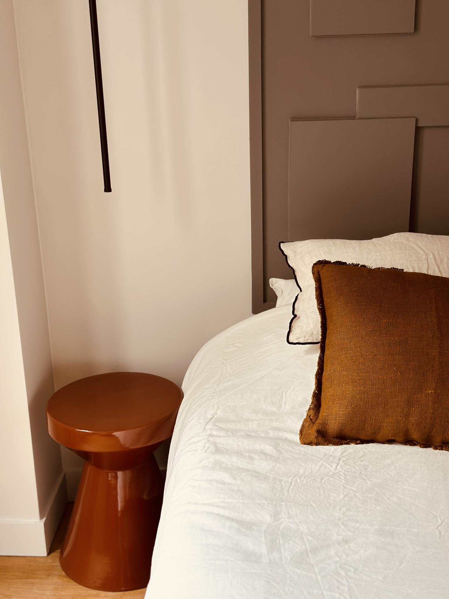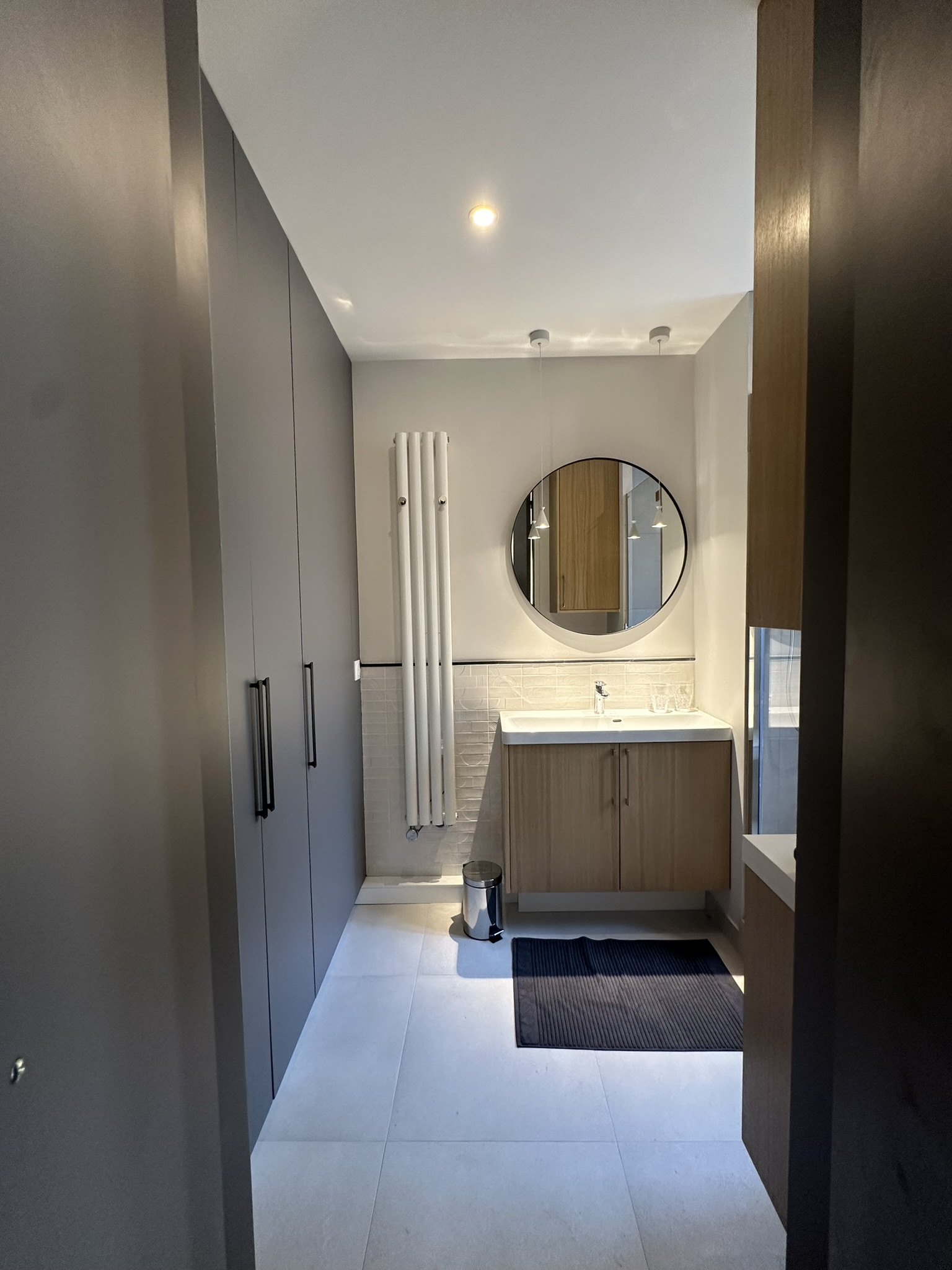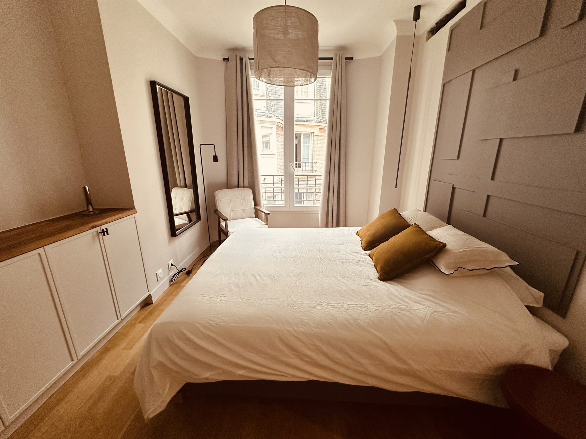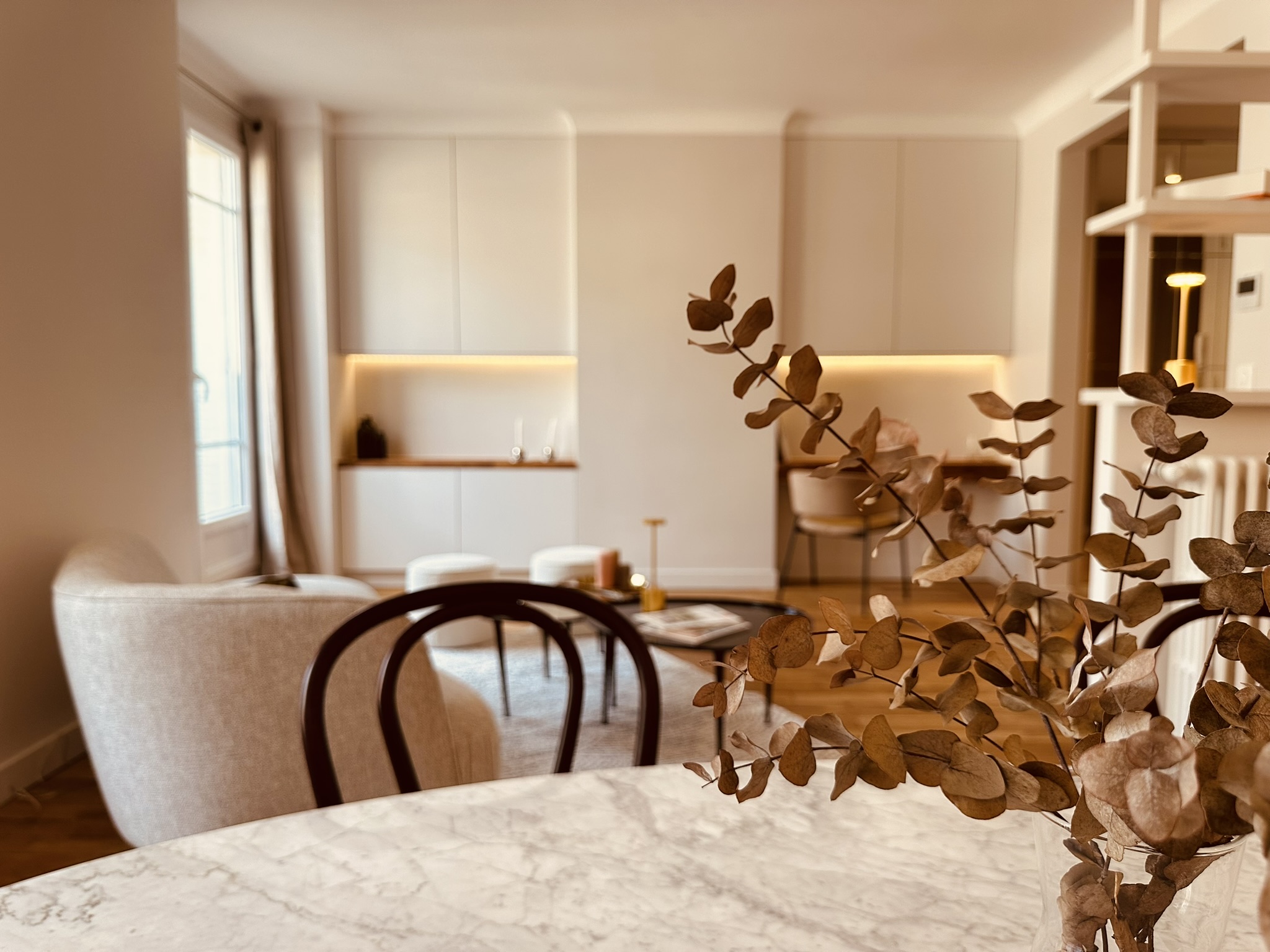 Le recours à la menuiserie sur mesure a permis la réalisation de nombreux rangements et de détails uniques (brise-vue, banquette, miroir XXL, tête de lit…) qui donnent un caractère certain au projet. Pour finir, un mobilier tout en rondeur et des matières nobles créent une atmosphère douce et chaleureuse, moderne et élégante où il fait bon évoluer.