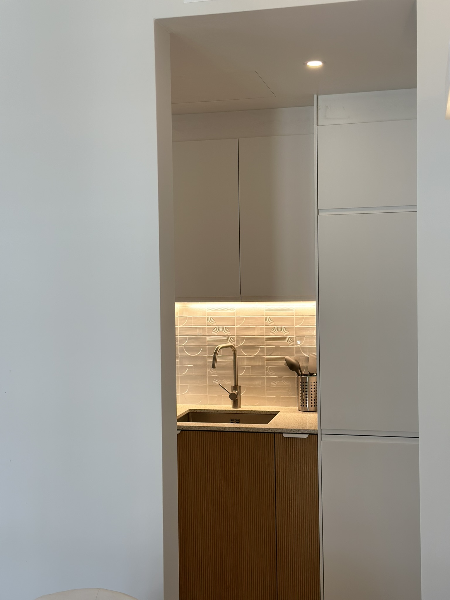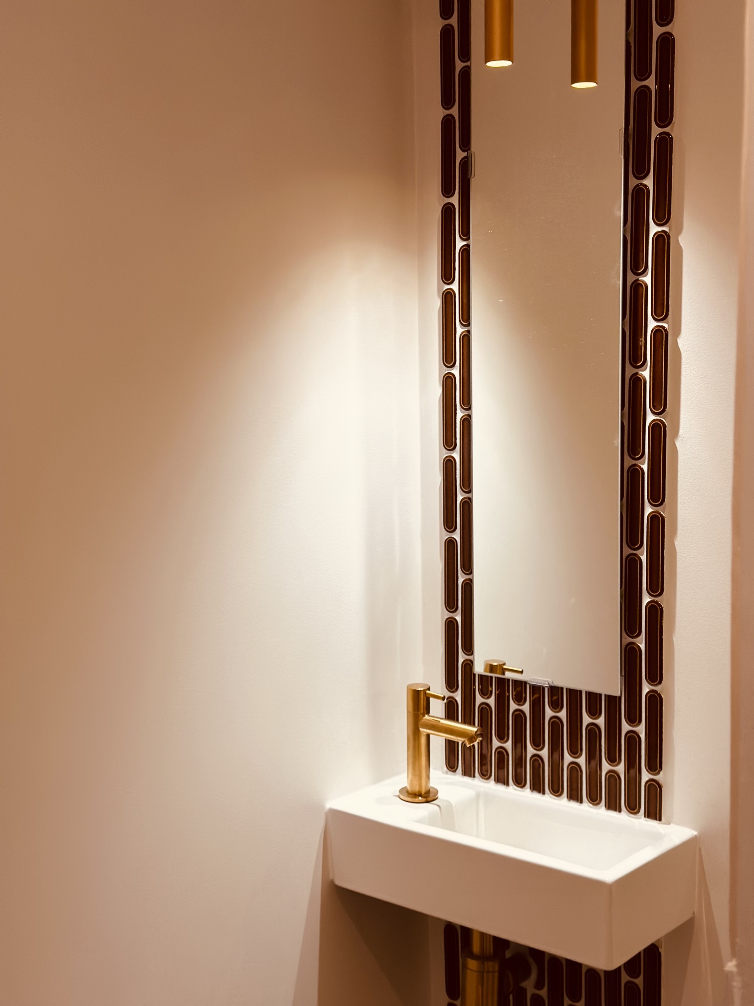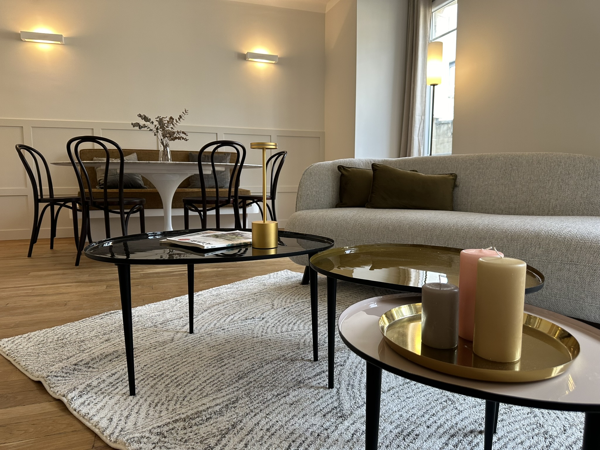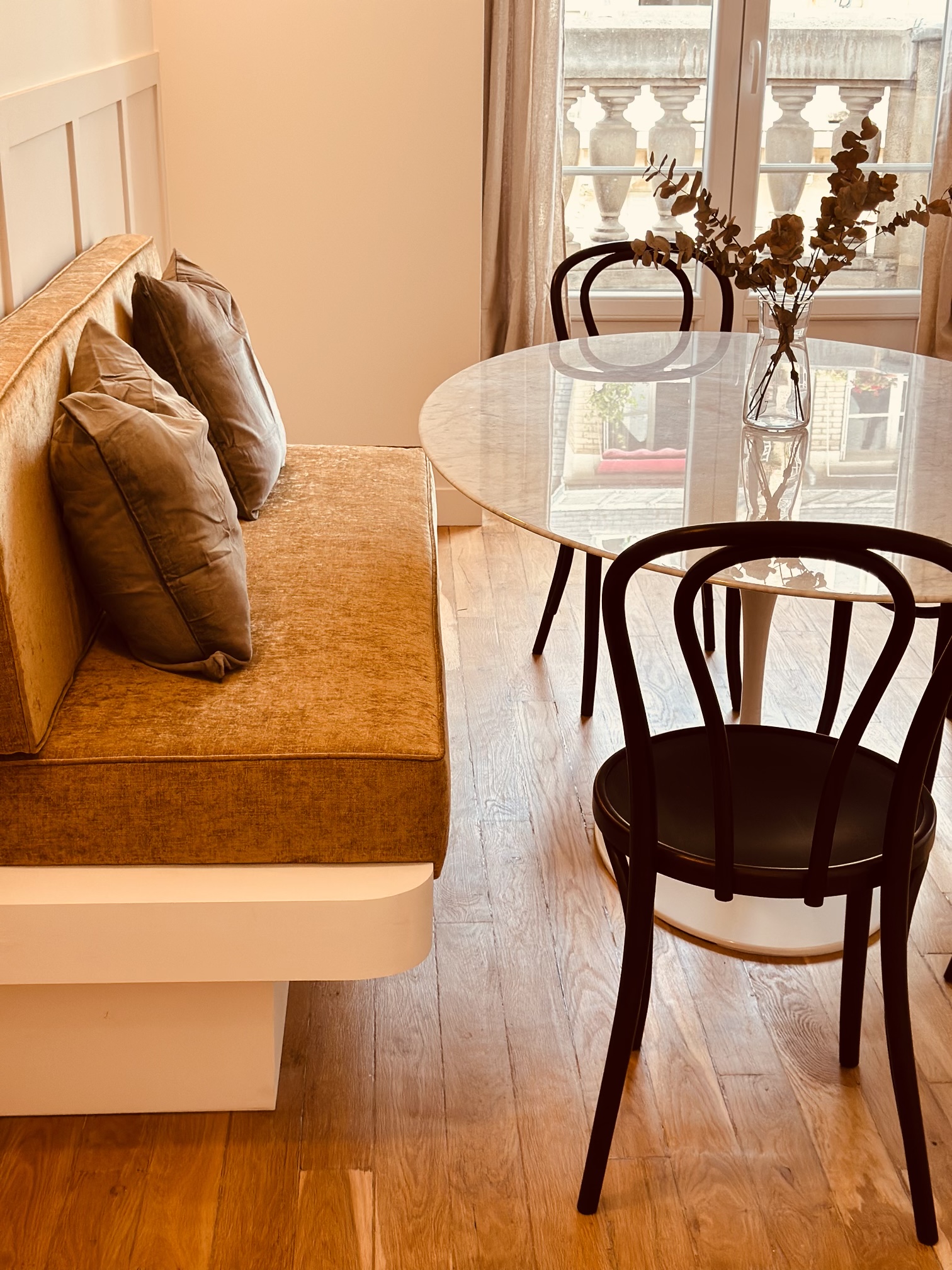 Le recours à la menuiserie sur mesure a permis la réalisation de nombreux rangements et de détails uniques (brise-vue, banquette, miroir XXL, tête de lit…) qui donnent un caractère certain au projet. Pour finir, un mobilier tout en rondeur et des matières nobles créent une atmosphère douce et chaleureuse, moderne et élégante où il fait bon évoluer.