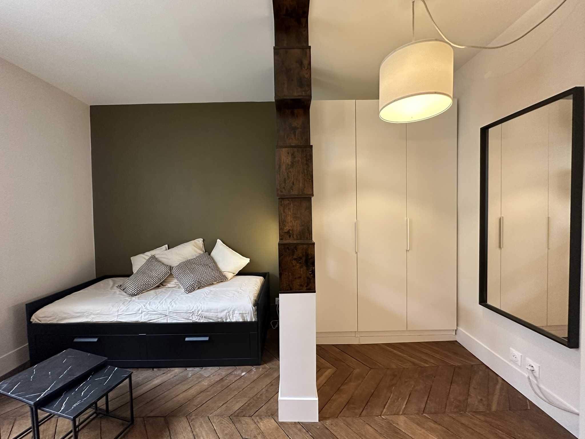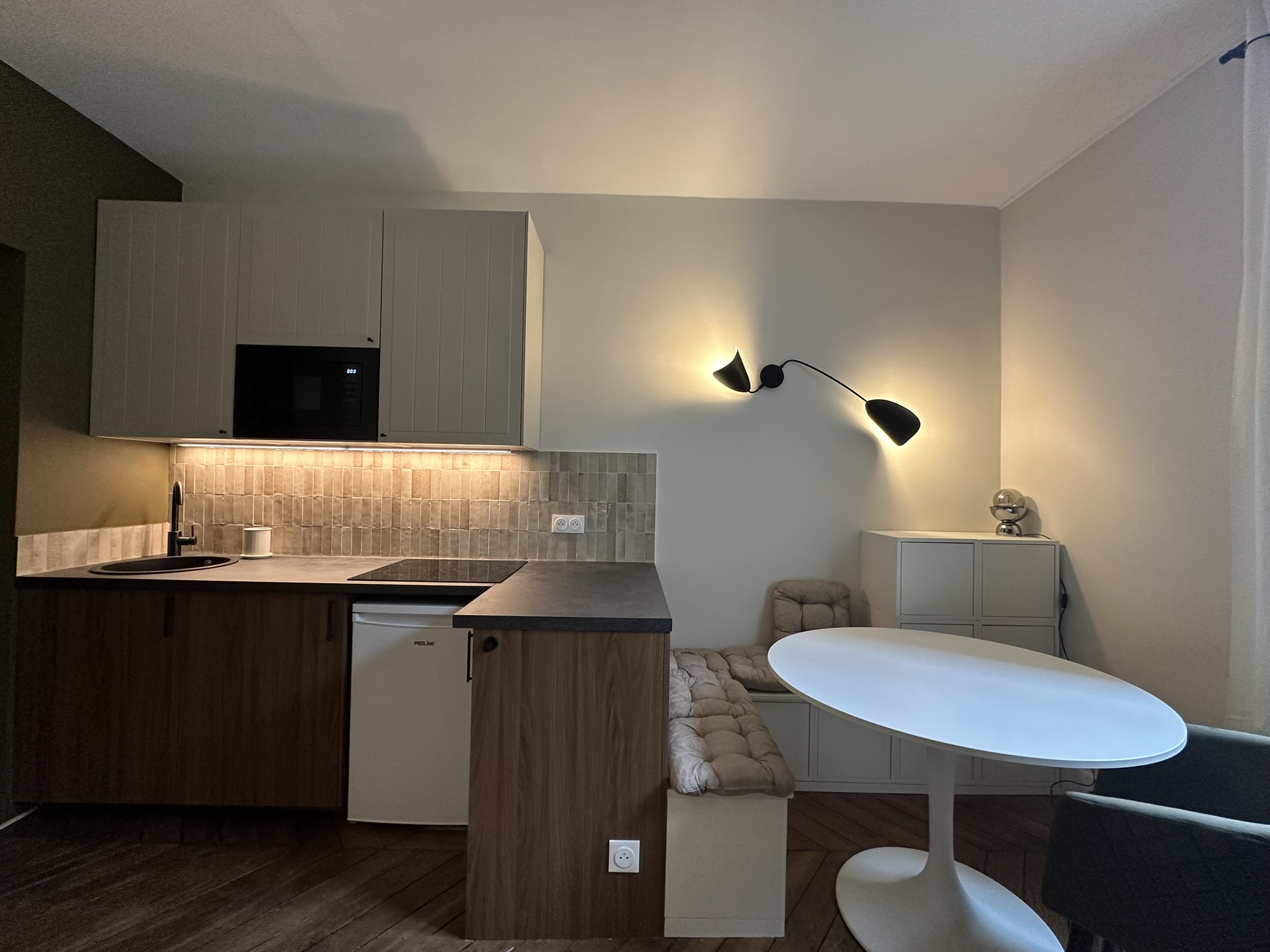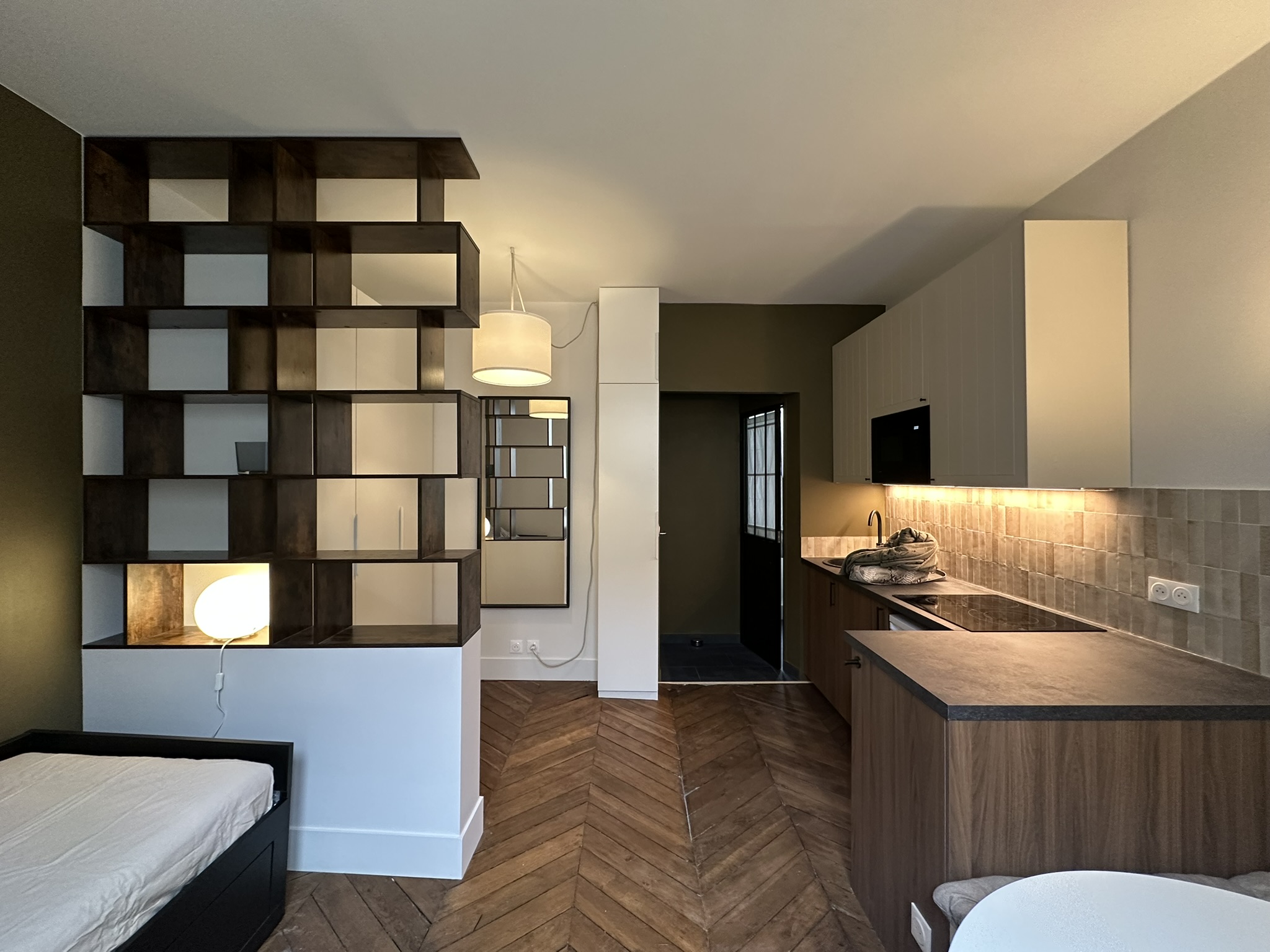 En plein cœur du quartier des Martyrs, au 2ème étage d’un immeuble du 19ème, ce 20m² a été totalement réhabilité. Pour ce bien destiné à la location, il a fallu faire preuve d’ingéniosité pour respecter l’enveloppe budgétaire fixée par le propriétaire tout en révélant le potentiel du lieu. Mobilier et matériaux de grandes enseignes ont été privilégiés pour optimiser l’aménagement avec un maximum de rangements et faire de ce studio un bien attractif (et rentable) sur le marché.