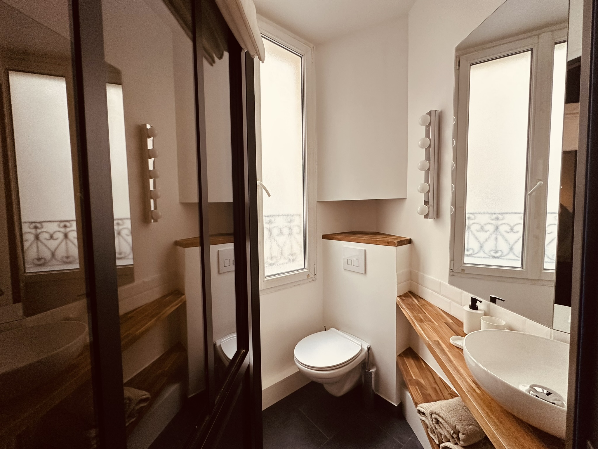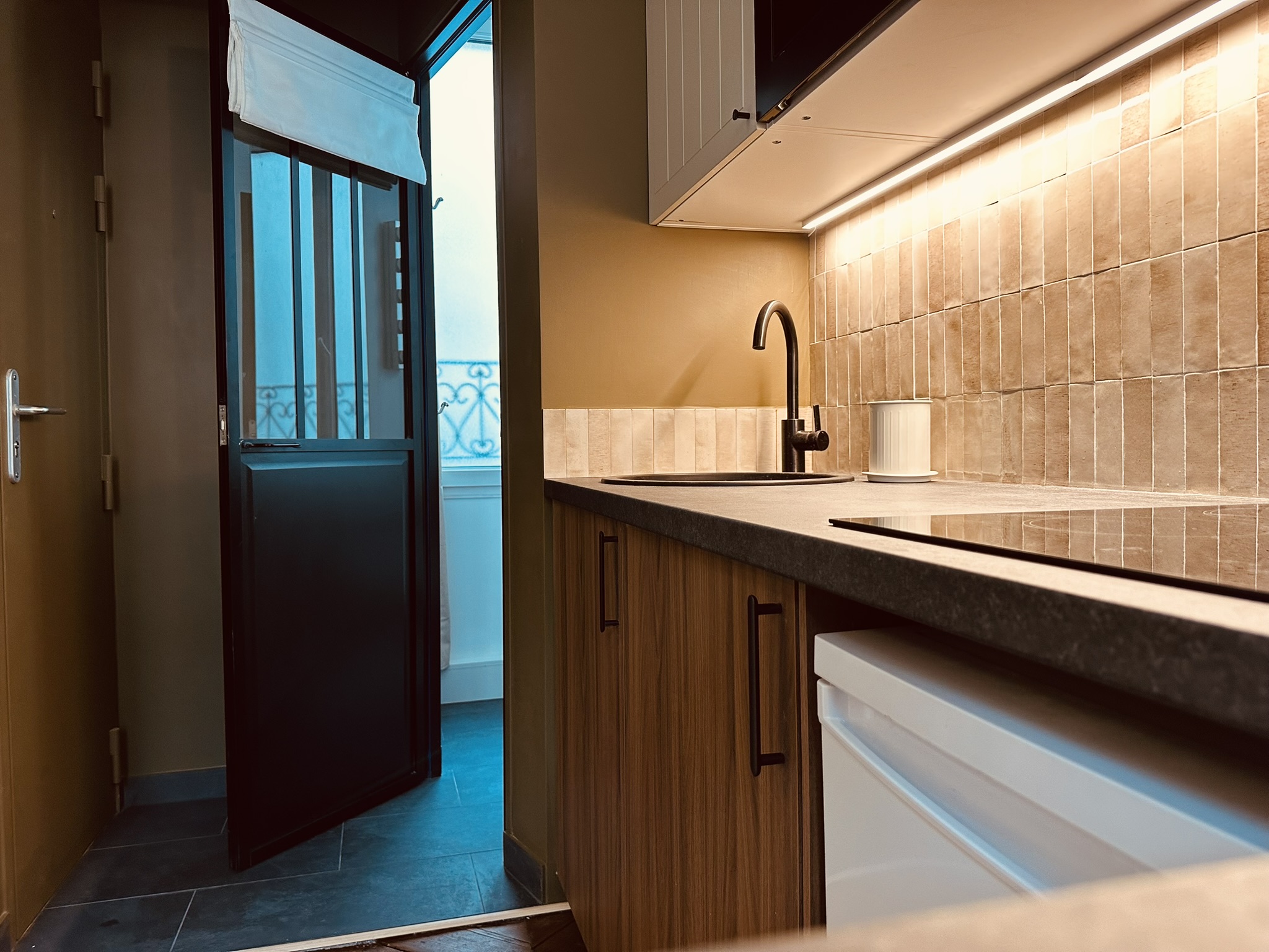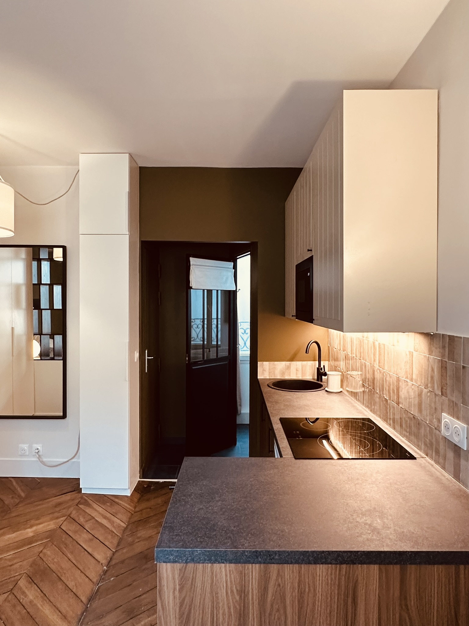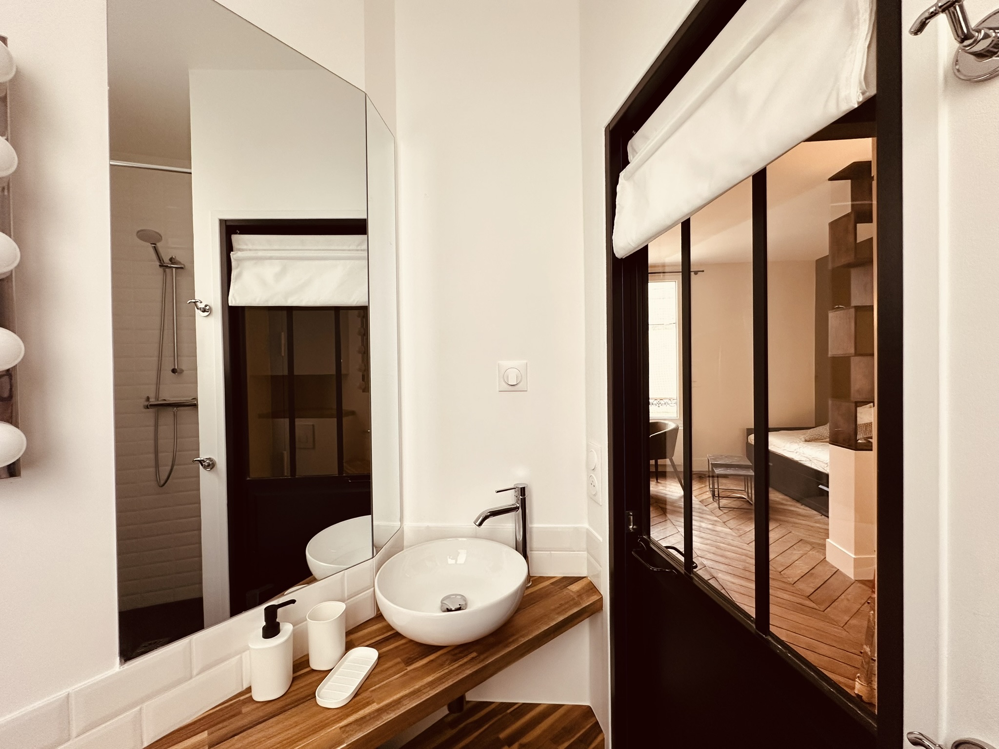 Aujourd’hui, teintes fortes et bois foncé lui donnent un caractère affirmé et rythment l’espace, la lumière, quant à elle, circule librement grâce à une porte d’atelier posée entre la salle de douche et la pièce de vie.